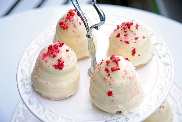 Smält chokladen tillsammans med kokosfettet i ett vattenbad. Doppa sedan gräddbullarna i chokladen och låt rinna av på ett galler och toppar dem med lite frystorkade jordgubbar eller hallon. Jag mixade lite av dem både. Låt sedan stå och svalna några minuter. Förvara dem sedan i kyl eller frys in dem för ett senare tillfälle.