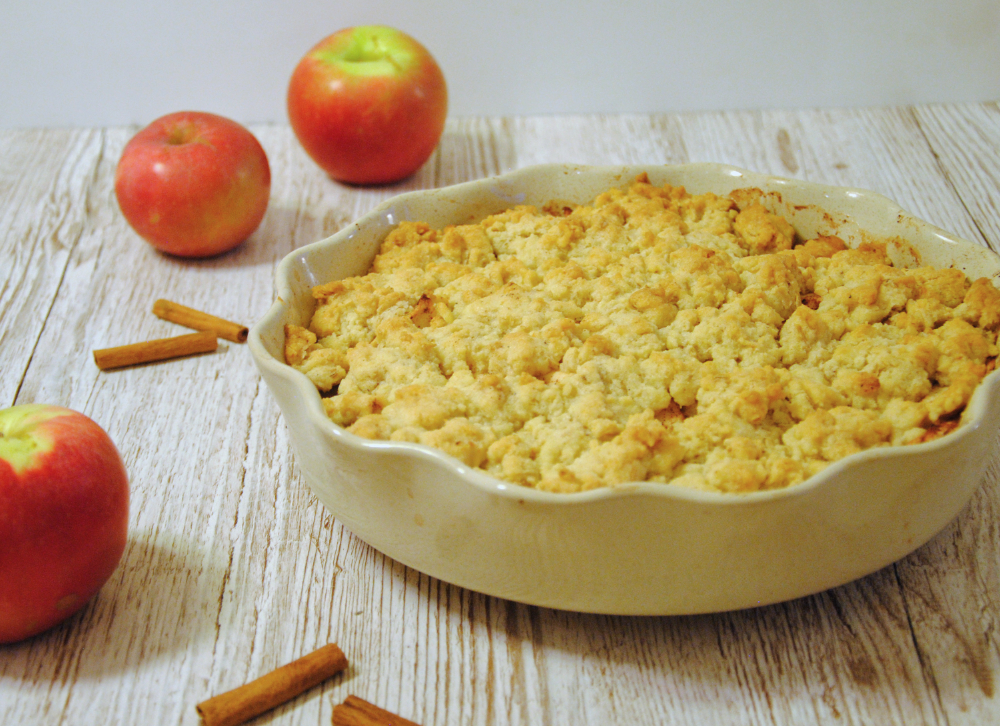 - Fördela smuldegen jämt över äpplena, så att det täcker så gott det går.
